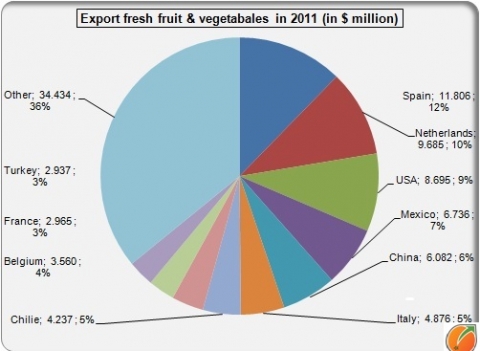 - Nederland is na Spanje de tweede exporteur van verse groenten en vers fruit. In 2011 exporteerde Nederland voor een waarde van ruim 9,5 miljard dollar. Spanje was nummer één met een waarde van 11,8 miljard dollar.