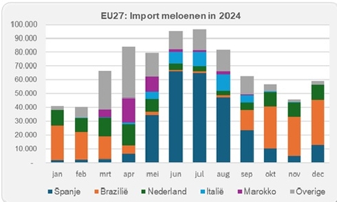 - De hoeveelheid meloenen die jaarlijks internationaal wordt verhandeld is de laatste jaren gedaald naar zo’n 2,1 miljoen ton.